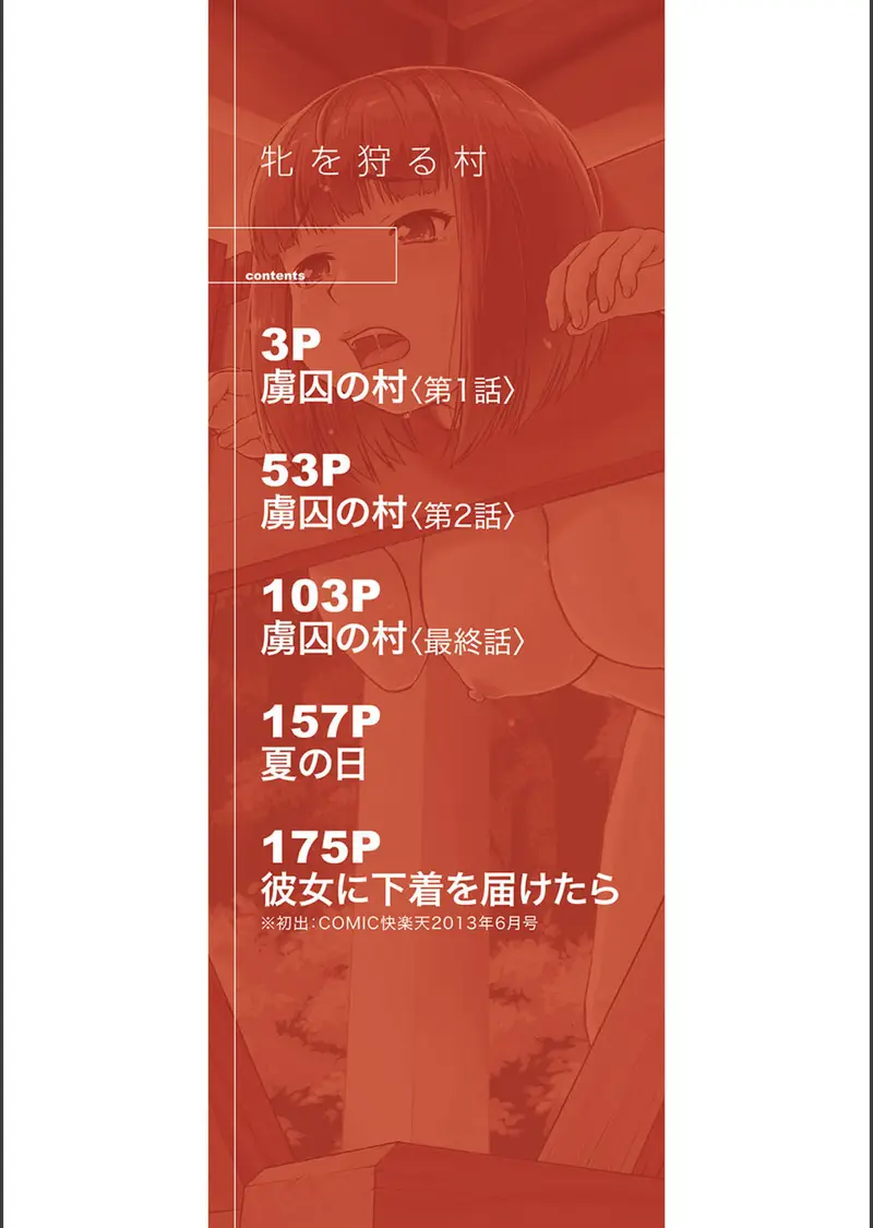 かろうじて脱出を図ろうとする二人の女子校生・純華と亜弥は、助けを呼ぶために行動するのだが……(『虜囚の村』より)【収録作品】1 虜囚の村〈全3話〉2 夏の日3 彼女に下着を届けたら※初出COMIC快楽天2013年6月号【購入特典】メッセージペーパー