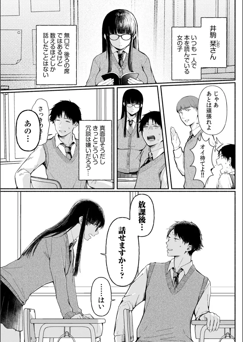 なんと夏休みまでに彼女を作れなければ、自分の部屋を妹にゆずらなければならないのだ!困った奏太が友人に相談をすると、なぜか奏太が後ろの席の無口な女子・井駒 栞(いこま しおり)さんのことを好きだと勘違いされる事態に…!?その日の放課後…呼び出された奏太は、思いがけず井駒さんから「私でよければ…」と言われ…その上いきなり押し倒されてしまった!状況が飲みこめず、なにをするつもりか聞く奏太にまたがり、「恋人同士がすることだよ…えっち。